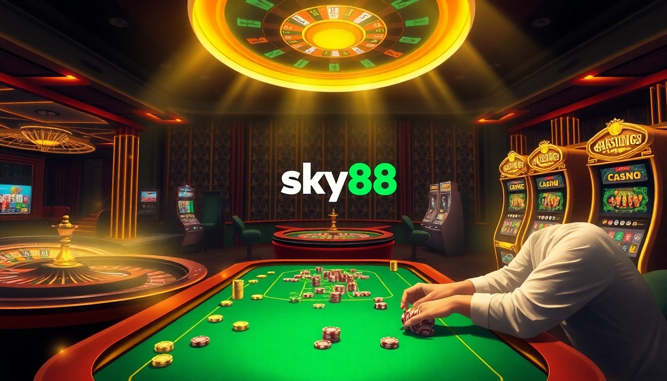 Sky88 immersive online gambling experience with poker tables and slot machines.